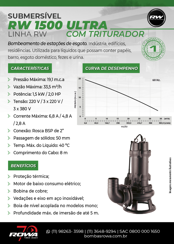 A Rowa do Brasil oferece as bombas submersíveis RW 1500 com triturador, desenvolvidas para o tratamento de estações de esgoto, com alto desempenho em ambientes exigentes como indústrias, construções civis, áreas agrícolas e de mineração. Projetadas para líquidos com sólidos e resíduos grandes, essas bombas garantem eficiência, resistência e operação contínua, mesmo nas condições mais adversas. O motor mais potente da Rowa, tritura fraldas, absorventes, preservativos etc!