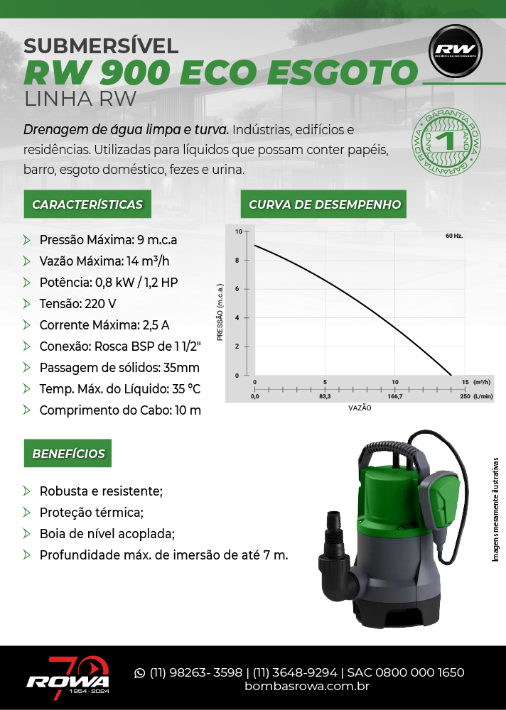 A linha de bombas submersíveis RW 900 da Rowa do Brasil para água limpa e turva é perfeita para quem busca soluções confiáveis e econômicas na drenagem de tanques, piscinas, cisternas, porões e estacionamentos alagados. Com operação automática, baixo consumo de energia e componentes de alta durabilidade, é ideal para aplicações residenciais e comerciais.