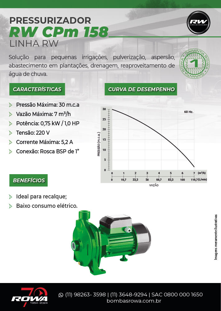 Com a Bomba Periférica CPm 158 da Rowa, você tem a segurança de um equipamento de alta qualidade, pronto para atender suas necessidades com eficiência e economia.