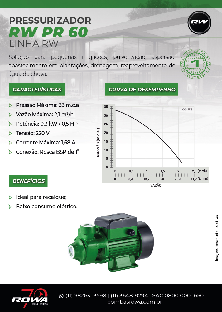 O PR-60 da Rowa é sinônimo de versatilidade e eficiência, garantindo excelente desempenho em pressurização, irrigação e transferência de água em diferentes segmentos.