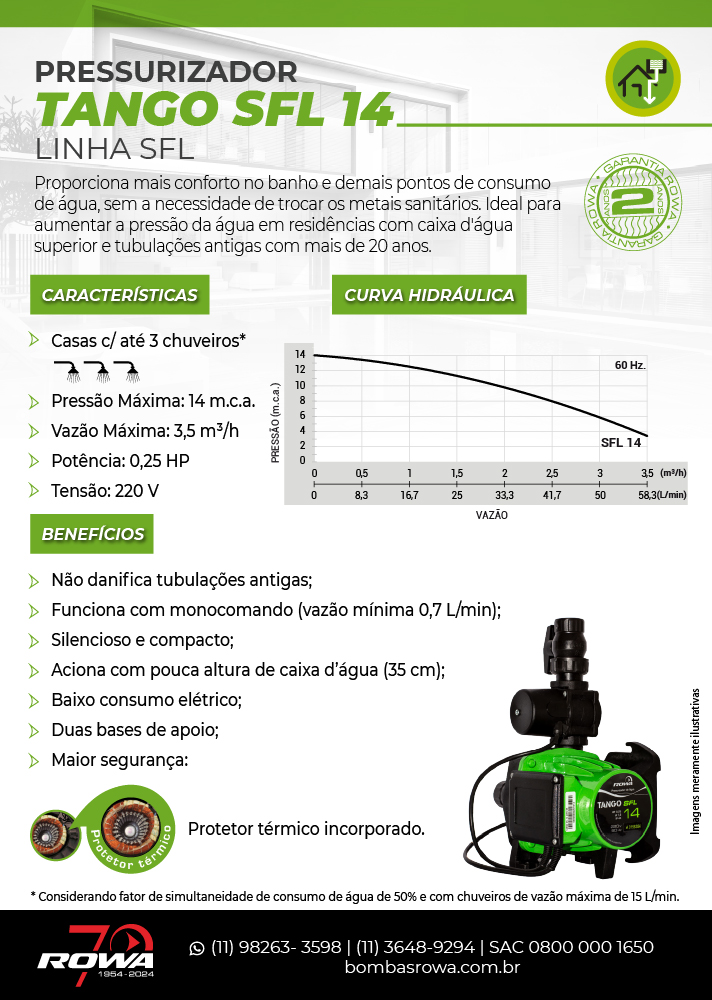 O pressurizador SFL 14 da Rowa do Brasil é a solução ideal para aumentar a pressão da água em residências com caixa d’água superior, especialmente em instalações antigas com tubulações e metais sanitários com mais de 20 anos. Com tecnologia silenciosa e funcionamento inteligente, esse modelo é indicado para casas com até 3 chuveiros, garantindo conforto e eficiência no uso simultâneo de água, sem comprometer a estrutura hidráulica.