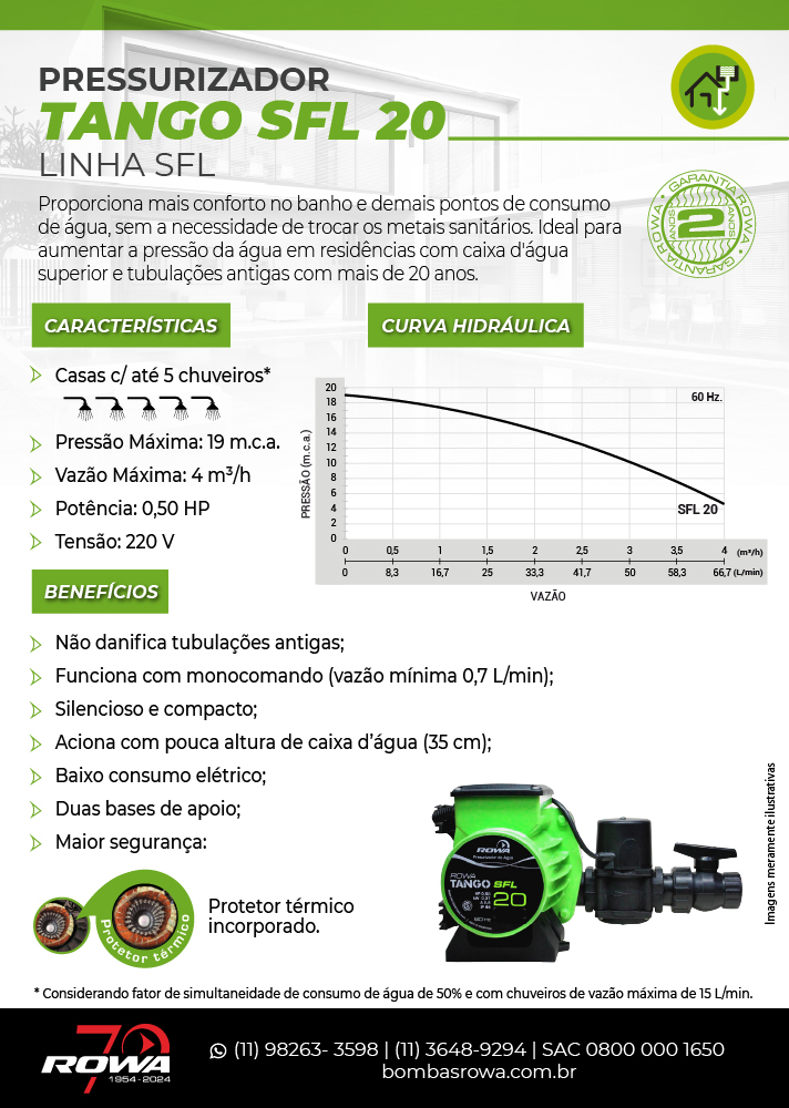O pressurizador SFL 20 da Rowa do Brasil é a solução ideal para aumentar a pressão da água em residências com caixa d’água superior, especialmente em instalações antigas com tubulações e metais sanitários com mais de 20 anos. Com tecnologia silenciosa e funcionamento inteligente, esse modelo é indicado para casas com até 5 chuveiros, garantindo conforto e eficiência no uso simultâneo de água, sem comprometer a estrutura hidráulica.