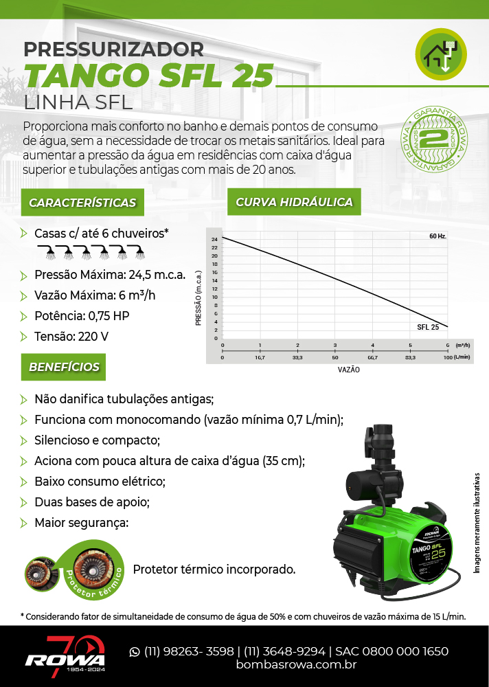 O pressurizador SFL 25 da Rowa do Brasil é a solução ideal para aumentar a pressão da água em residências com caixa d’água superior, especialmente em instalações antigas com tubulações e metais sanitários com mais de 20 anos. Com tecnologia silenciosa e funcionamento inteligente, esse modelo é indicado para casas com até 6 chuveiros, garantindo conforto e eficiência no uso simultâneo de água, sem comprometer a estrutura hidráulica.