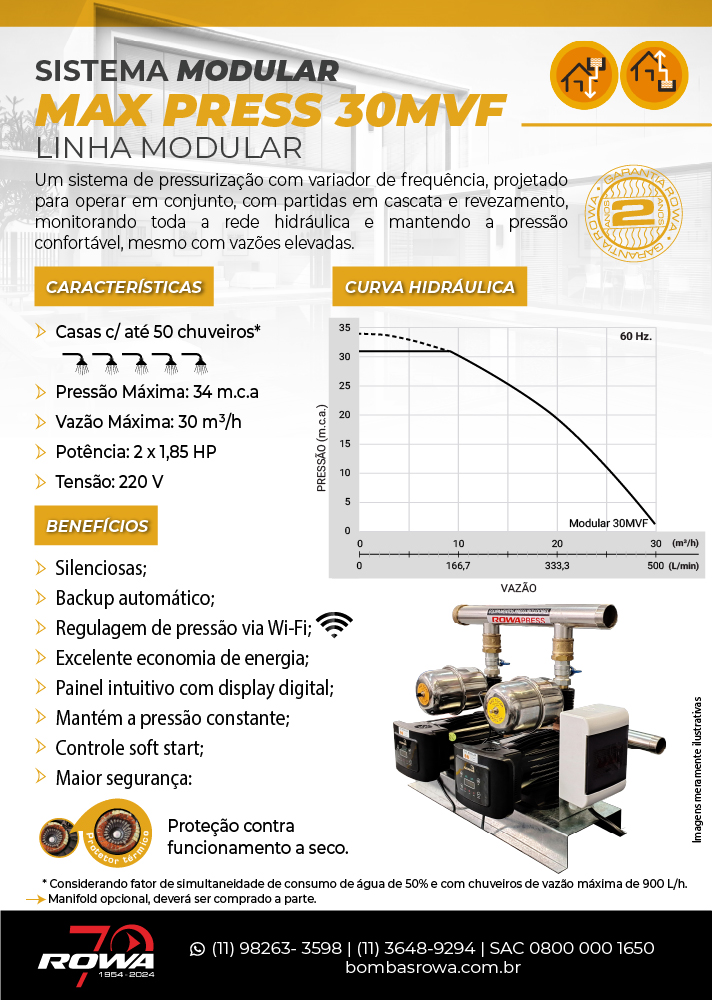 - Variador de Frequência (VF): Ajusta automaticamente a pressão da água para oferecer conforto em toda a rede hidráulica