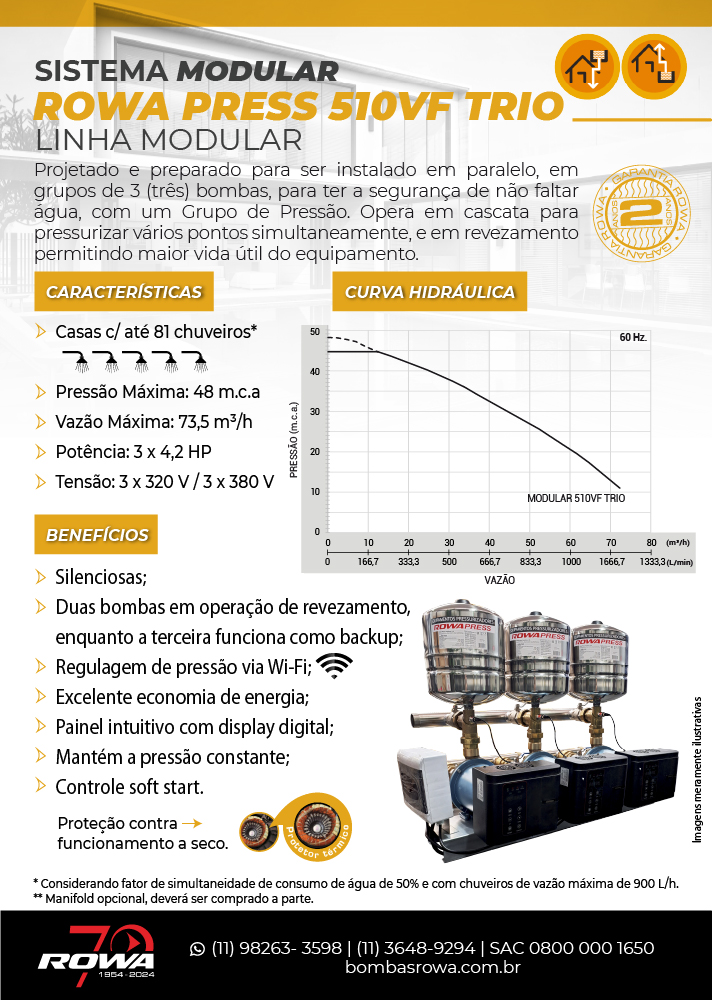 O novo Sistema Modular Trio Rowa com Variador de Frequência (VF) foi desenvolvido para atender projetos que exigem grande vazão e pressão constante, sem comprometer a eficiência energética.