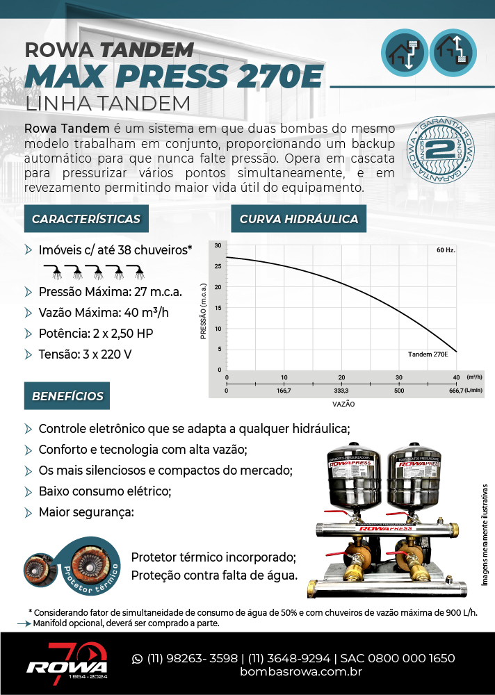 O Sistema Rowa Tandem permite que duas bombas do mesmo modelo operem juntas, garantindo maior desempenho hidráulico e um backup automático em caso de falha. Trabalha em cascata, atendendo múltiplos pontos de consumo ao mesmo tempo, e em revezamento, prolongando a vida útil dos equipamentos e garantindo confiabilidade total para sua instalação.
